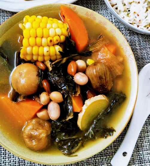 材料:南北杏,菜干,花生,玉米,红萝卜,无花果,蜜枣,姜;